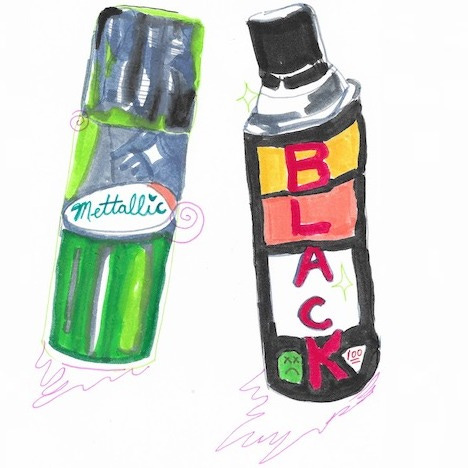You need to add some colour back into your life. I almost typed ‘yourself’, if that means anything to you. Two spray cans—black and silver—hurl themselves at you. They nearly miss your head. That was a warning if I ever did see one. Anyway, I bought them in January to spray-paint something on my suitcase but never got around to it. So they’re a bit upset with me. Put them to good use. Shake well.